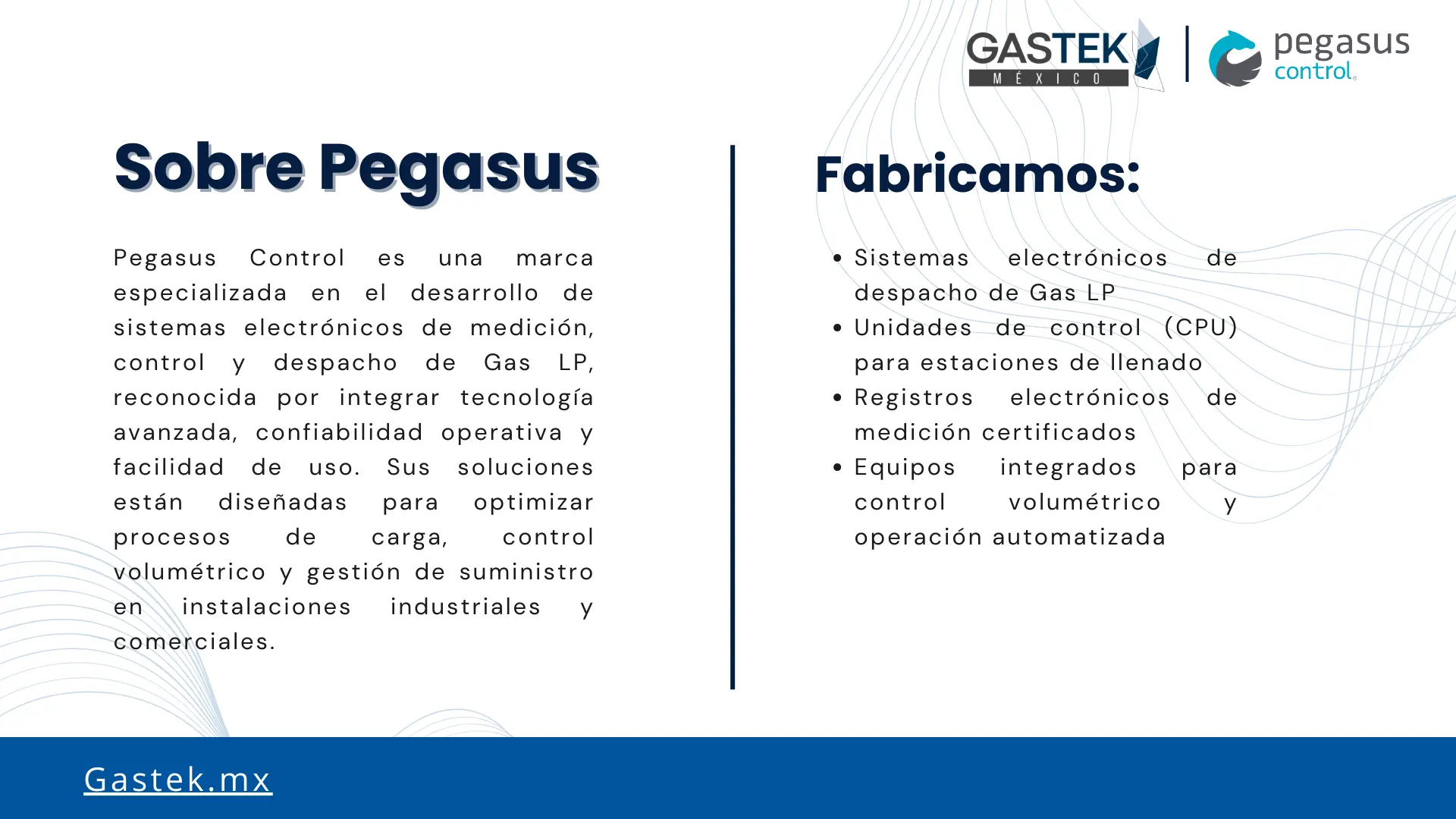 Pegasus Control es una marca enfocada en desarrollar sistemas electrónicos de medición para gas LP, asi como tambien para su control y despacho en plantas y estaciones, sus soluciones están enfocadas en la optimización de procesos de carga, control volumétrico y gestión de suministro en instalaciones industriales y comerciales.
