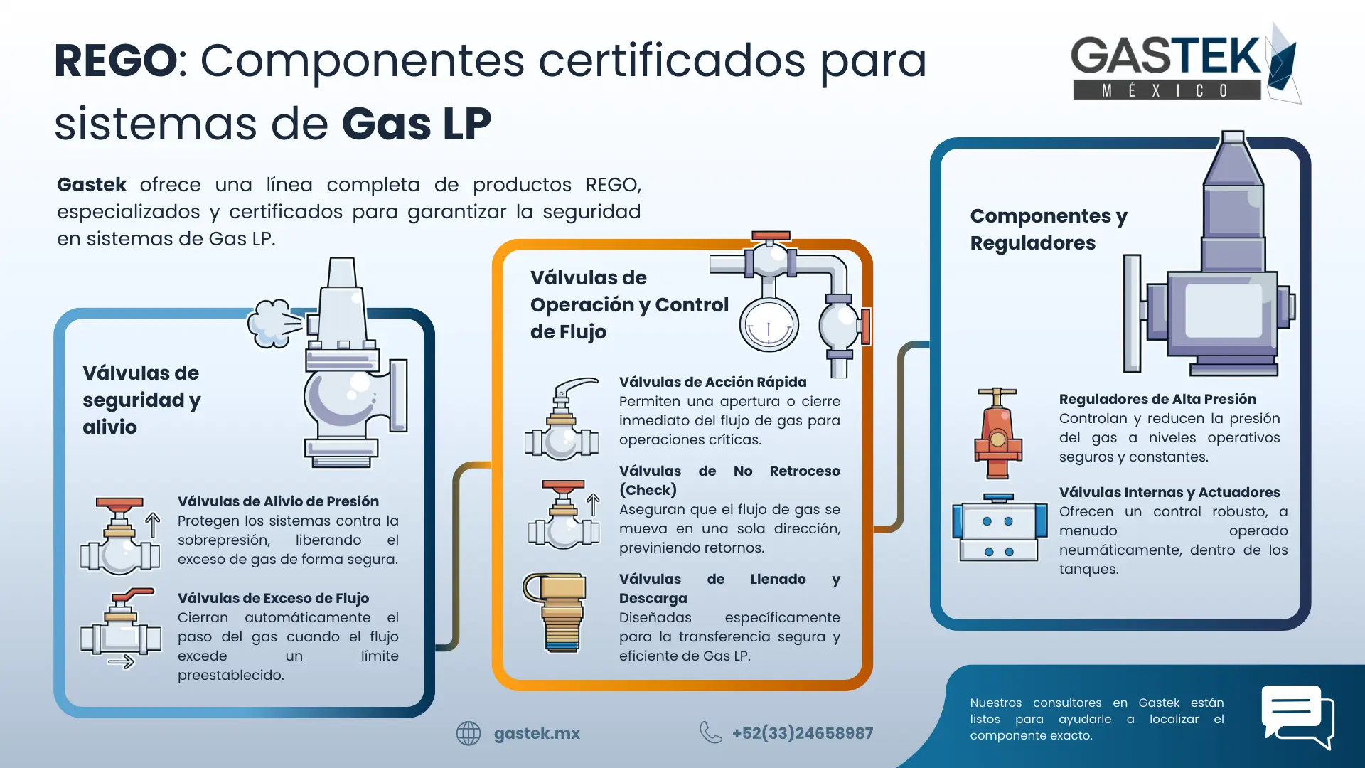 La combinación de reguladores, válvulas, actuadores e instrumentación de REGO proporciona una solución completa y confiable para cualquier sistema de Gas LP. Para asistencia en la selección del componente ideal para su aplicación, nuestro equipo está a su disposición.